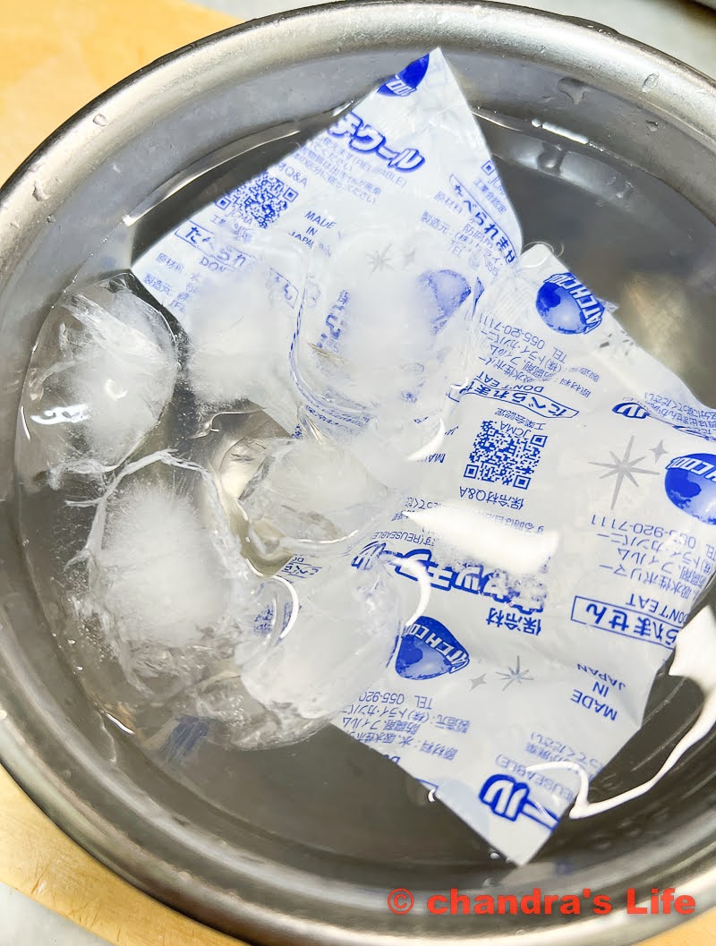もう一回り大きなボウルだと全部 保冷剤でいけるんですが 保冷剤より若干 水が冷えるのに時間がかかるようで 早めに投入しておいた方が良いみたいです